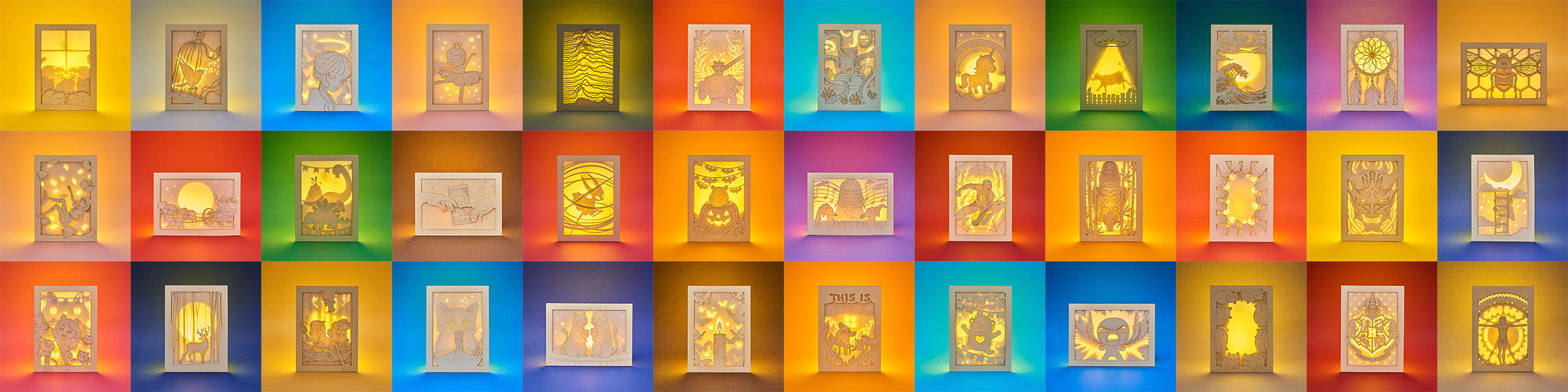 ORIGAMECO cards are unique paper artworks with intricately cut designs. Each card features a sturdy ivory white paper frame with detailed cutouts that come to life when backlit. A hidden translucent vellum layer adds depth and creates a soft glow, while the heavyweight paper feels substantial and pleasant to touch.