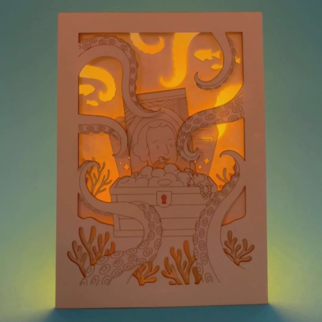While these cards look beautiful on their own, ORIGAMECO truly comes to life when backlit. While you can look into LED frames and freestanding displays, there's no need for any fancy equipment—any ambient light will do great, and even the simplest lamp will work wonders. All our photos and videos purposefully use the simplest nursery nightlight (a capybara silicone lamp, to be exact) with the card propped against it.