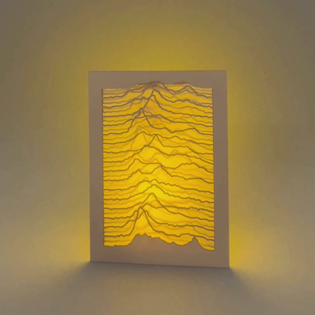 🎵 Stylish ORIGAMECO card that will elevate any music lover's room. This card is crafted in a highly detailed style and faithfully recreates the iconic Joy Division cover for the legendary album "Unknown Pleasures," which famously features pulsar waves from a signal received by a radio telescope at Jodrell Bank Observatory. This design appeals to music fans, space enthusiasts, and design history lovers alike, making it a perfect conversation piece. Plus, it will fit beautifully into any modern or minimalist interior.